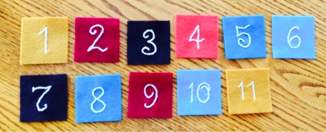Laying out my squares to determine what order they should go in and learning how to embroider! I think I did ok on my first two numbers, I'm no pro, but the imperfections of being handmade is what will make the calendar "special" right?!?